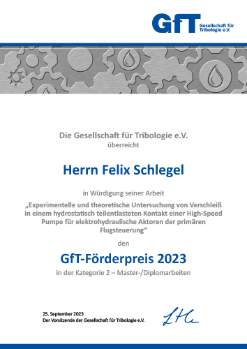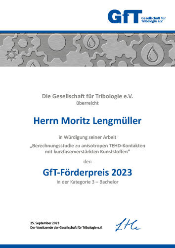 Mit Förderpreisen für Nachwuchswissenschaftler wurden im Jahr 2023 eine Bachelor- und eine Masterarbeit ausgezeichnet. Herr Moritz Lengmüller erhielt einen Förderpreis für seine Bachelorarbeit mit dem Titel „Berechnungsstudie zu anisotropen TEHD-Kontakten mit kurzfaserverstärkten Kunststoffen“, Herr Felix Schlegel für seine Masterarbeit über die „Experimentelle und theoretische Untersuchung von Verschleiß in einem hydrostatisch teilentlasteten Kontakt einer High-Speed Pumpe für elektrohydraulische Aktoren der primären Flugsteuerung“. Die Preisverleihung nahm Rolf Luther zusammen mit Andreas Kailer, einem Mitglied des Komitees zur Verleihung der Förderpreise vor. Beide Arbeiten wurden zusammen mit dem Gewinner-Vortrag des „Young Tribological Researchers Symposium 2023“ in einer Session am Dienstag vorgestellt. Kurzfassungen der Arbeiten der Preisträger werden in einer der nächsten Ausgaben von Tribologie und Schmierungstechnik zu finden sein.