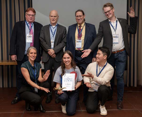 TriboSlam 2023 (vlnr): 1. Reihe: Mirjam Bäse (Organisation), Victoria Schröder (Gewinnerin), Sunghyun Woo, 2. Reihe: Mathias Woydt, Rolf Luther, Leif Busse, Niklas Bauer (Organisation, Moderation)
