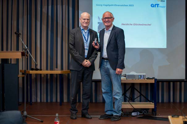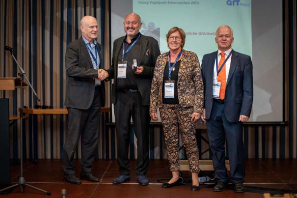 Das Georg-Vogelpohl-Ehrenzeichen für Persönlichkeiten, die sich in besonderem Maße um die Tribologie verdient gemacht haben, wurde in diesem Jahr Herrn Peter Weismann verliehen. Sein Wirken für die Tribologie wurde in der Laudatio von Rüdiger Krete gewürdigt. Sie wird in Kürze unter „Ehrungen“ auf der GfT-Webseite und in einer der nächsten Ausgaben von Tribologie und Schmierungstechnik veröffentlicht.