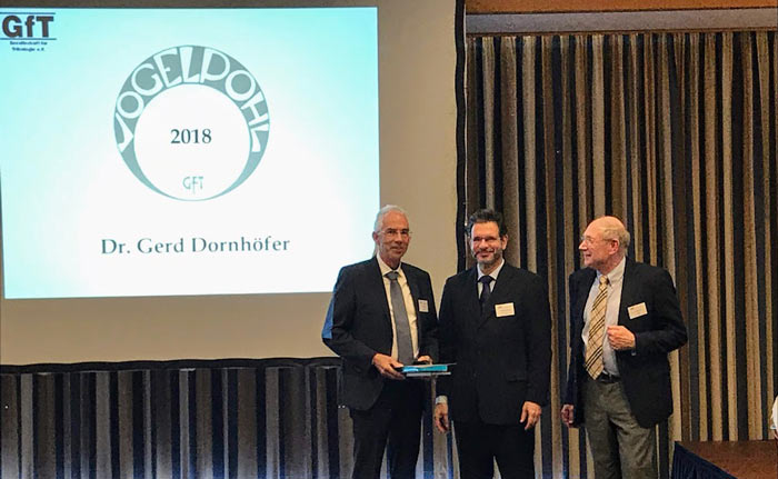 Mit dem Georg-Vogelpohl-Ehrenzeichen, der höchsten deutschen Auszeichnung auf dem Gebiet der Tribologie, wurde in diesem Jahr Dr. rer. nat. Gerd Dornhöfer ausgezeichnet. Die von Prof. Poll gehaltene Laudatio finden Sie unter „Ehrungen“ (Link einfügen) auf dieser Website.