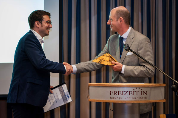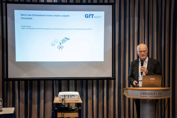 Weiter ging es mit der inzwischen traditionellen Verleihung des von der Firma Werner Stehr Tribologie gestifteten Preises „Tribologie ist überall“, der an Rolf Luther für seinen letztjährigen TriboSlam-Beitrag über die Tribologie der Schuhschnürung ging.