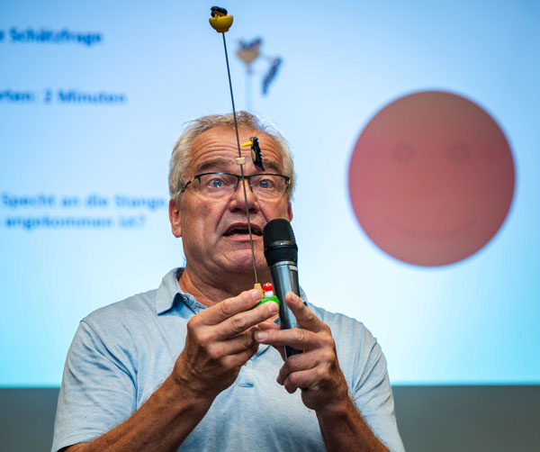 Das Konferenz-Dinner am Dienstagabend wurde durch ein „Kneipenquiz“ aufgelockert. Per Los wurden Teams zusammengestellt, die gemeinsam verschiedene Fragen in jeweils zwei Minuten lösen mussten. Neben Wissens- gab es auch eine tribologische Schätzfrage: wie viele Stick-Slip-Vorgänge benötigt ein federgelagerter Holzspecht um sich an einer Stange von oben nach unten zu bewegen (siehe auch Foto unten).