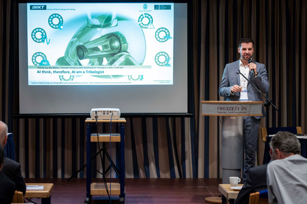 Die weiteren Plenarvorträge spiegelten wichtige aktuelle Richtungen tribologischer Forschung wider. Im Vortrag von Prof. Carsten Gachot (TU Wien) ging es um die außergewöhnlich niedrige Reibung von 2D-Materialien wie MXenen und Übergangsmetall-Carbo-Chalcogeniden. Die sehr aktuelle Anwendung von künstlicher Intelligenz für die Tribologie beleuchtete Prof. Max Marian (Uni Hannover und Pontificia Universidad Católica de Chile). Beendet wurde das wissenschaftliche Programm des ersten Tages mit dem Vortrag von Prof. Martin Dienwiebel (Fraunhofer KIT) über das Verständnis tribologischer Mechanismen durch Kombination multiskaliger Experimente und Simulation.