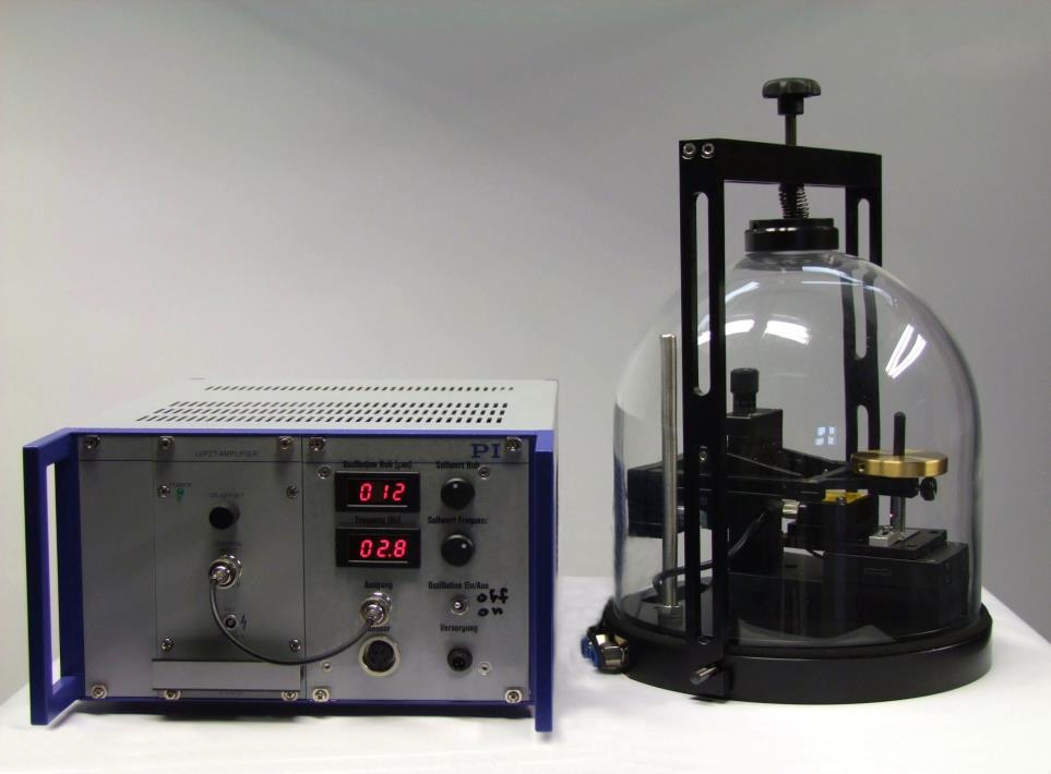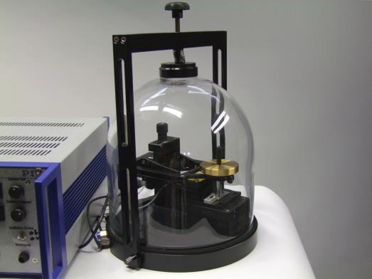 | Kurzbeschreibung des Prüfstandes | Der gesamte tribologische Prüfaufbau befindet sich unter einem luftdichten Glassturz. Die Messkammer wird mit dem zu prüfenden Gas oder Atmosphäre konstant gespült oder evakuiert. Die oszillierende Bewegung der Unterprobe wird durch einen piezoelektrischen Antrieb erreicht. Dieser Antrieb kann sowohl sehr kleine (0.1 Hz), als auch sehr hohe Frequenzen (100 Hz) und sehr kleine Wege im 5 μm-Bereich. Damit können Vorgänge simuliert werden, die z.B. durch Wärmeausdehnung ablaufen oder Vibrationen von Bauteilen im Reibkontakt mit Mikrobewegungen. Da bei sehr kleinen Hüben und hohen Reibkräften die elastische Deformation des Prüfaufbaus den Gleitweg verfälscht, wird der Ist-Weg durch einen Lasersensor gemessen und über einen Regelkreis ständig korrigiert. Die Reibkraft wird durch einen Präzisions-DMS-Sensor ermittelt. Die Reibungszahl wird berechnet. Unterschiedliche Prüfkörperdicken können durch eine Vertikal-Führung ausgeglichen werden. |