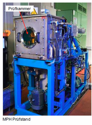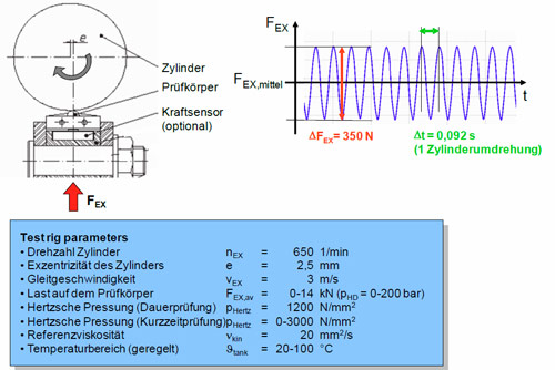 | Kurzbeschreibung des Prüfstandes | Der Kern des Prüfstands besteht im Wesentlichen aus einem exzentrisch rotierenden Zylinder (Gegenkörper) und einem zylindrischen Prüfkörper, die hydraulisch unter definierten Lastzyklen aufeinander gepresst werden und dabei aufeinander abwälzen. Dieser dynamisch belastete Linienkontakt (Wälzkontakt) befindet sich in der Prüfkammer des Prüfstands und ist komplett von der temperaturgeregelten Prüfflüssigkeit umgeben. Eine MPH-Prüfung beinhaltet zwei Arten von Einzelprüfungen. Die erste Prüfung (Kurzzeitprüfung) dient der Bestimmung der Belastung, bei der erste Anzeichen eines adhäsiven Materialübertrags der Prüfkörper „Fressen“ zu erkennen sind; die Prüfdauer dieser Kurzzeitprüfung beträgt max. 3 h. Die zweite Prüfung (Dauerprüfung) mit einer Dauer von 40 h dient der Bestimmung des abrasiven Materialabtrags am Prüfkörper und der Ermittlung des Verlaufs des mittleren Reibungskoeffizienten im Linienkontakt. Jede Prüfung wird zur statistischen Absicherung der Ergebnisse dreimal durchgeführt; der Prüfablauf ist automatisiert. |