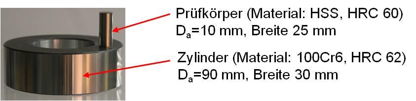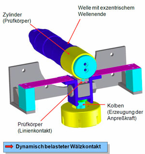| Art des Prüfstandes | Modellprüfstand; dynamisch belasteter Wälzkontakt (Linienkontakt), bestehend aus zwei zylindrischen Prüfkörpern |