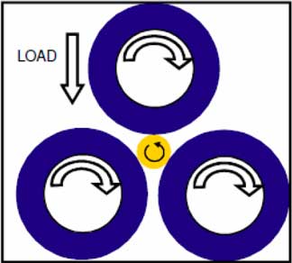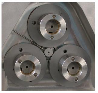 | Kurzbeschreibung des Prüfstandes | Drei gleichmäßig angetriebene äußere Scheiben wirken auf einen zentralen, unabhängig angetriebenen Prüfkörper. Hierdurch werden 3 Abrollkontakte je Prüfkörperumlauf realisiert, wodurch ein schnellerer Verschleißeintritt hervorgerufen wird. Die Verschleißbeurteilung erfolgt mit Hilfe optischer Messverfahren am zentralen Prüfkörper. Beim Eintritt von Macropitting schaltet das Gerät ggf. aufgrund der auftretenden Schwingungen ab. |