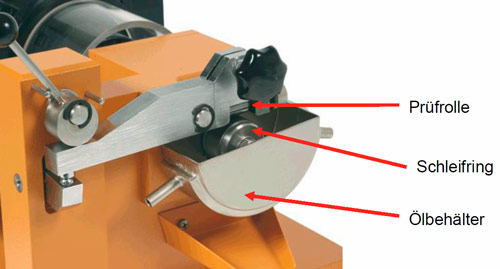 | Ergänzende Angaben | Materialpaarungen z.B. bei der Lagerschmierung können durch Verwendung entsprechender Werkstoffe für Schleifring und Prüfrolle untersucht werden. |