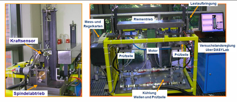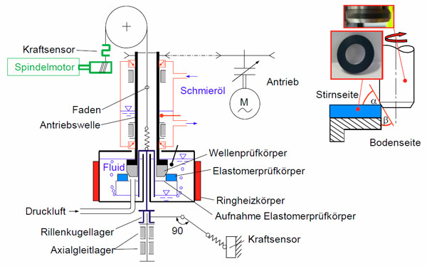 | Kurzbeschreibung des Prüfstandes | Die Antriebswelle des RWDR-Tribometers ist als Hohlwelle ausgebildet. Über einen Elektromotor und einen Riementrieb wird diese angetrieben. Der Wellenprüfkörper ist am unteren Ende der Antriebswelle zentrisch montiert. Mittels Spindelantrieb, der über ein Seil mit der Elastomerprüfkörpereinspannung verbunden ist, wird der Elastomerprüfkörper gegen den Wellenprüfkörper gedrückt. Der Elastomerprüfkörper besitzt die Form eines Kreisringes,der Wellenprüfkörper ist ein Kegelstumpf. Die Anpresskraft kann während des Versuchs variiert werden. Der Raum unter dem Elastomerprüfkörper ist mit Luft befüllbar. Somit können dieBetriebsbedingungen am Radialwellendichtring nachgebildet werden. Der Ölbehälter wird mit einem Ringheizkörper temperiert. Das vom Wellenprüfkörper auf den Elastomerprüfkörper übertragene Reibmoment wird mittels eines Kraftsensors gemessen. Dabei wird über einen Hebel die Kraft ermittelt, die benötigt wird, um ein Mitdrehen der Elastomerprüfkörperaufnahme zu verhindern. Um zu erreichen, dass der Elastomerprobekörper keine statische Exzentrizität aufweist, erfolgt die Lagerung der Elastomerprüfkörperaufnahme über ein Rillenkugellager und die Elastomerprobe selbst. Durch diese Wahl der Lagerung im Elastomerprobekörper kann die statische Exzentrizität zu Null angenommen werden. Die in der Kontaktzone entstehende Reibungswärme wird über den Wellenprüfkörper in dasFluid und in die Hohlwelle abgeleitet. Durch Kühlung des Schmieröls kann die Temperatur der Hohlwelle konstant gehalten werden, so dass einheitliche Versuchsbedingungen herrschen. |