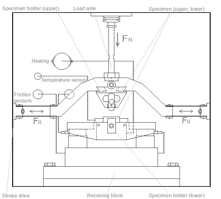 | Kurzbeschreibung des Prüfstandes | Ein elektromagnetischer Antrieb erzeugt die Linearbewegung. Die Parameter Gleitweg, Frequenz, Temperatur, Normalkraft, Hubposition und Testzeit werden in weiten Bereichen frei gewählt und sind dyna-misch, auch während des Versuchs, variierbar. Das softwarege-steuerte Gerät erfasst mit hoher Zeitauflösung die Beanspruchungs-parameter und die tribologischen Messdaten. Die modulare Prüf-körperaufnahme erlaubt beliebige Prüfkörpergeometrien und -ab-messungen. In der Grundausführung können Prüfungen von -35°C bis +350°C ausgeführt werden und mit Zubehör bis +1.000°C. Die Umrüstung zum unidirektionalen Gleiten ist gegeben. |