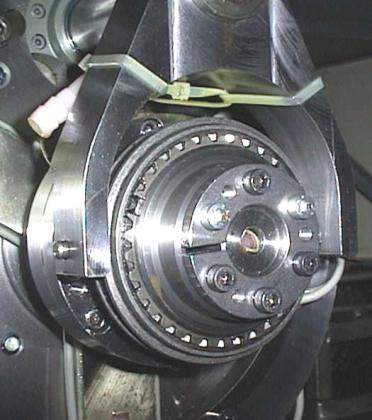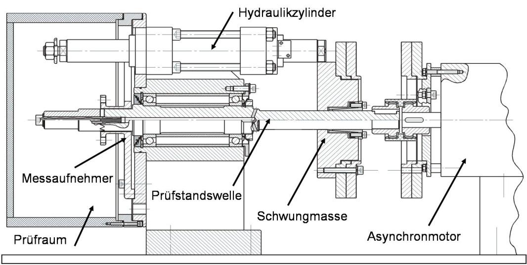 | Kurzbeschreibung des Prüfstandes | Das Grundprinzip des Universal Reibflächenprüfstands besteht darin, dass der Prüfkörper in Verbindung mit einer Schwungmasse auf eine vorgegebene Drehzahl, welche der zu untersuchenden Differenzdrehzahl entspricht, beschleunigt und über die zu untersuchende Reibfläche gegen die stillstehenden, fest mit dem Messaufnehmer des Prüfstandes verbundene Gegenreibfläche abgebremst wird. Über die rechnerbasierte Prüfstandssteuerung werden die Axialkraft, das Reibmoment, die Drehzahl sowie bis zu drei Temperturmessstellen aufgezeichnet. Die Welle des Prüfstandes ist in Spindellagern gelagert. Hierdurch wird eine hohe Steifigkeit der Wellenlagerung, eine gute Zentrierung der Prüfteile sowie eine problemlose Montage erreicht. Der Prüfkörper wird mittels zentrierender Spannsätze mit der Welle verbunden, so dass die Montage von Prüfteilen verschiedener Abmessungen möglich ist. |
