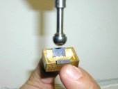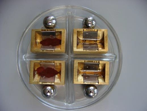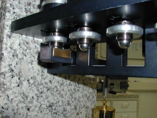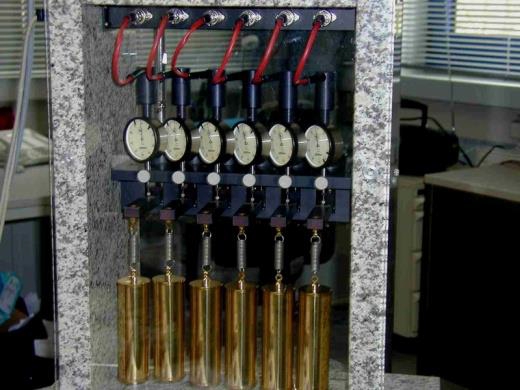 | Kurzbeschreibung des Prüfstandes | Die sechs Oberproben (Prüfkugeln) werden gemeinsam über einen Getriebemotor angetrieben. Die Unterproben (Prismen) werden durch Gewichte über Wippen gegen die Oberprobe gedrückt. Der Gesamtverschleiß der Reibungspartner wird mit induktiven Wegsensoren gemessen und zusätzlich auf analogen Messuhren angezeigt. Der Prüfstand wird vollständig PC-gesteuert. Die Versuchsdauer kann vorgegeben werden, optional auch die Gleitgeschwindigkeit. Während der Messung wird online ein Diagramm mit der Gesamtverschleißtiefe angezeigt. Das Prüfergebnis wird zur Auswertung gespeichert. Mit einem separaten Auswertungsprogramm können die Flächenpressung, der Verschleißfaktor und das Verschleißvolumen über dem Verschleißweg dargestellt werden. |