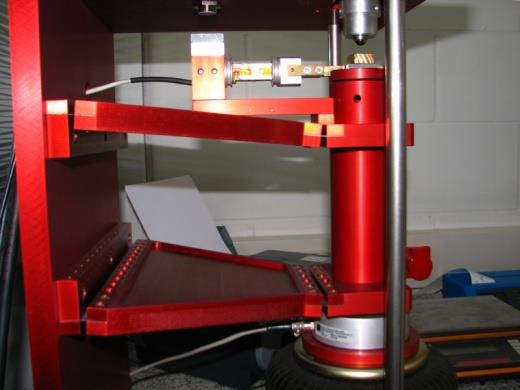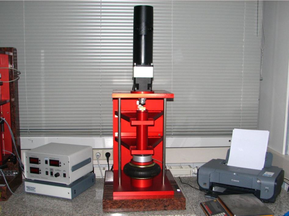 | Kurzbeschreibung des Prüfstandes | Der Prüfstand ist extrem steif aufgebaut, um auch hohe Normalkräfte und Reibmomente aufzunehmen. Der XTM 3000 wurde zur zerstörenden Messung ausgelegt (z.B.: Verschweißen der Proben, Durchbruch der Gleitschicht, katastrophaler Verschleiß, Reibungshochlage). Zur Steuerung können Zeit, Last und Gleitgeschwindigkeit vorgegeben werden. Die Messbereiche können je nach Anwendungsfall ausgewählt werden. Durch die reibungsfreie Parallelführung der Messplattform kann auch bei kleinen Kräften empfindlich gemessen werden. Die Reibmoment-Messplattform kann zur Probenmontage aus dem Prüfstand herausgenommen werden. Die Normalkraft wird über einen Hochlastfaltenbalg pneumatisch erzeugt. Der Faltenbalg erhält seinen Innendruck durch einen von Hand einstellbaren Feindruckregler. Optional kann auch ein motorisch angetriebener und PC-geregelter Normalkraft-Regler eingebaut werden. |