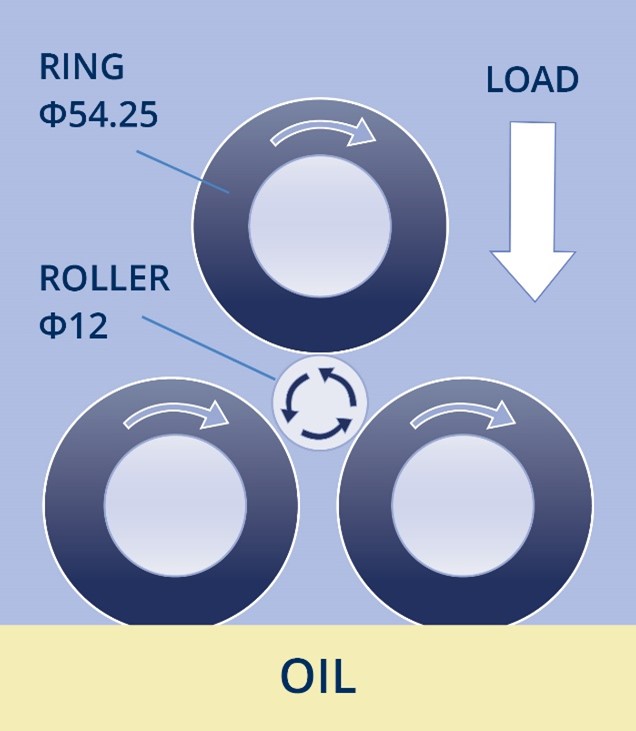 | Verwendete Prüfkörper und Kontaktgeometrie | Drei äußere Scheiben (je ⦰= 54,25 mm) gegen eine innere Rolle (⦰= 12 mm) im Zentrum. ![]() |